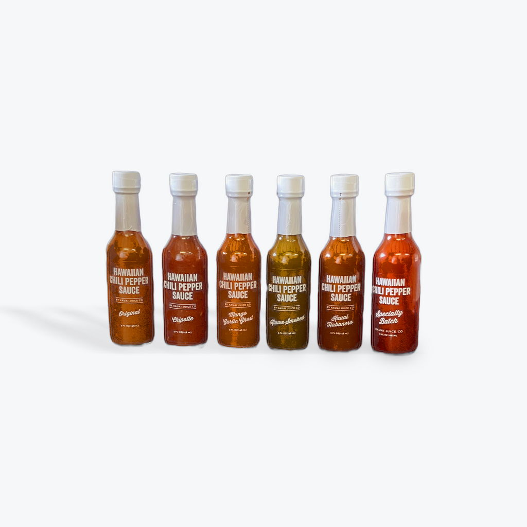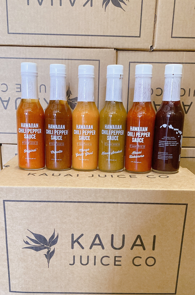 This package includes our favorite flavors of our Kauai Juice Co. hot sauce line including our least spicy to spiciest sauces, and several in between. It makes the perfect gift for the hot sauce lover in your life.