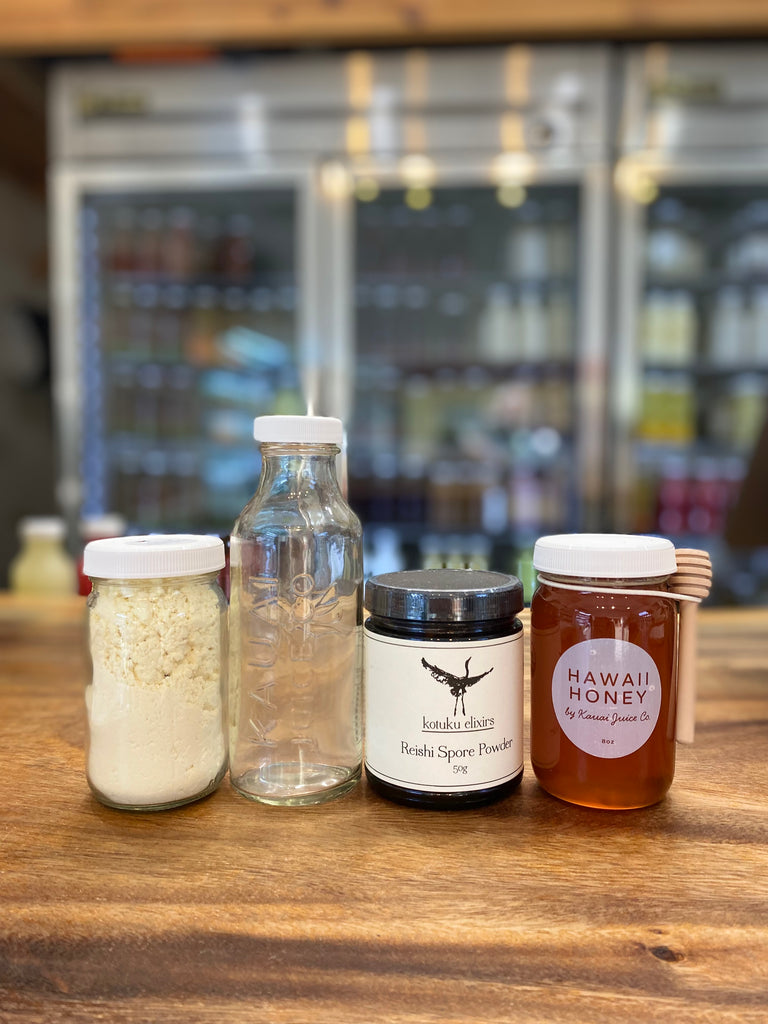You've heard it called the "brownie", "chocolate", "heaven in a shot glass" But the proper name is actually the Reishi River through the Land of Milk and Honey! Yes, we know its a bit extra but its truly one of the most magical shots we offer! And the best part about it-its SO good for you!!